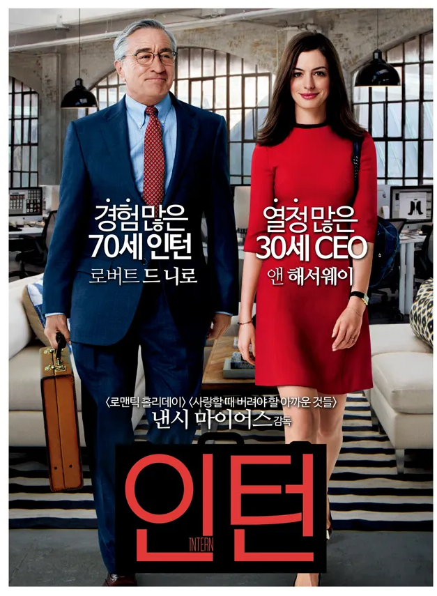 "인턴(2015)"는 인터넷 의류 업체 "About the Fit"의 창업자인 줄스 오스틴 씨는 기업의 사회공헌 차원에서 65세 이상 노인을 대상으로 하는 노인 일자리 사업 인턴 프로그램을 시작했습니다. 과거 전화번호부 출판 회사 "덱스 원"의 임원으로 재직하다가 정년퇴직하고 아내와 사별 후에는 그동안 쌓인 마일리지로 여행을 즐기던 70세의 벤 휘태커 씨는, 다시 사회로부터 자신의 필요성을 느끼고 자존감을 높이기 위해 인턴 프로그램에 지원, 합격했습니다. 벤 씨는 줄스 씨의 개인 인턴으로 배정되어 업무를 시작하셨지만, 줄스 씨는 그런 벤 씨에게 회의적인 입장이었습니다. 그러나 벤 씨의 연륜에서 묻어나는 처세술과 각종 노하우들에 점점 신뢰를 갖게 되셨고, 개인 운전기사도 맡게 되며 둘은 베스트 프렌드가 되었습니다. 또한 벤 씨는 회사 내부의 마사지사 피오나와 로맨틱한 관계로 발전하셨고, 나이어린 회사 동료들에게는 연애 상담, 클래식 스타일 코디 등을 알려주며 친근한 아버지와도 같은 관계를 맺어나가게 되었습니다.
